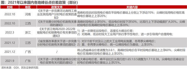 前面提到,終端看政策。2022年12月22日,國家發(fā)改委、國家能源局印發(fā)《關于做好2023年電力中長期合同簽訂履約工作的通知》,要求各地制定同本地電力供需和市場建設情況相適應的中長期合同分時段價格形成機制,合理拉大峰谷價差,加強中長期與現(xiàn)貨價格機制銜接。自2021年下半年以來,全國已有河南、江西、浙江、河北、山西、廣東、山東等超過20個省市調整分時電價政策,要求適度拉大峰谷電價差水平。