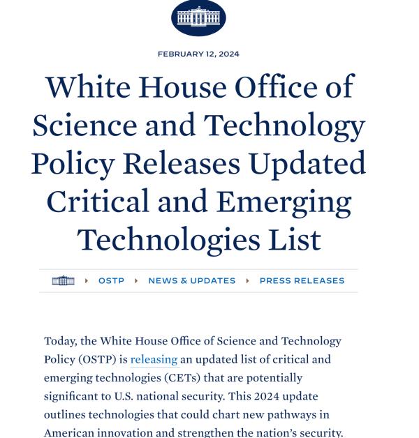 2024年2月,美國國家科學(xué)技術(shù)委員會(NSTC)發(fā)布了新一版關(guān)鍵和新興技術(shù)(Critical and emerging technologies, CETs)清單。CETs清單以美國2020年發(fā)布的《關(guān)鍵和新興技術(shù)國家戰(zhàn)略》為基礎(chǔ),每兩年更新一次關(guān)鍵和新興技術(shù)領(lǐng)域列表,及各領(lǐng)域內(nèi)的具體技術(shù)清單。