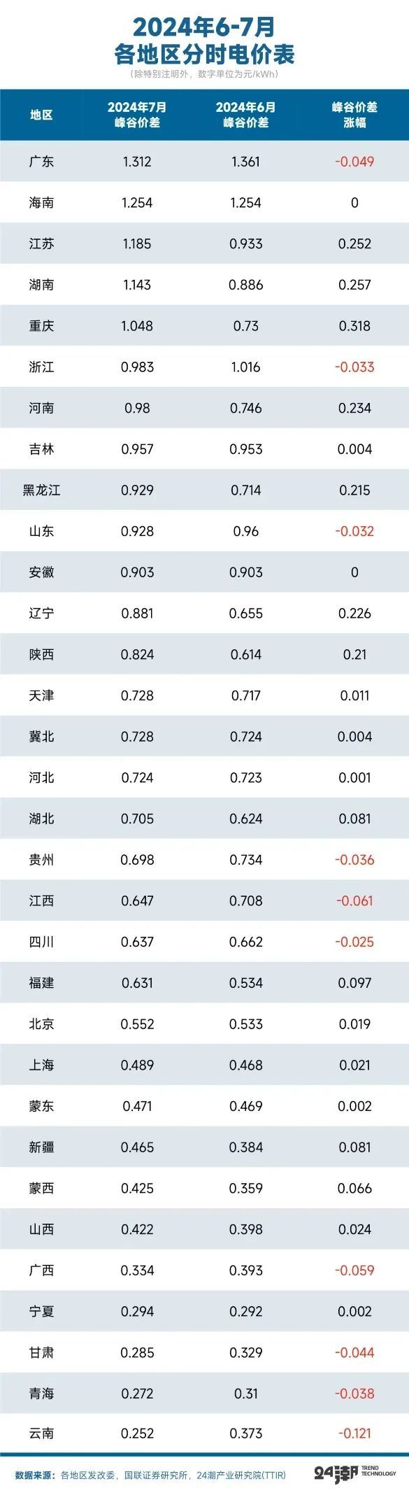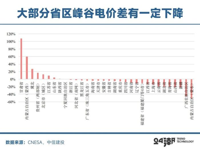 這并非危言聳聽,根據(jù)東海證券統(tǒng)計(jì),今年以來浙江、河南、江蘇多地發(fā)布分時(shí)電價(jià)調(diào)整政策,全國(guó)范圍內(nèi)峰谷電價(jià)差縮窄趨勢(shì)顯著,河南省分時(shí)電價(jià)調(diào)整新政亦正式落地。此外根據(jù)中關(guān)村儲(chǔ)能聯(lián)盟對(duì)32個(gè)省區(qū)的分析,今年1-8月份一般工商業(yè)1-10kV電網(wǎng)代理購(gòu)電最大峰谷價(jià)差平均為0.68元/kWh,較2023年同比下降了6.7%。與2023年1-8月相比,今年各地最大峰谷價(jià)差普遍呈現(xiàn)下降趨勢(shì),僅甘肅、蒙西、冀北等8個(gè)地區(qū)價(jià)差有所提高,其他地區(qū)均為下降。