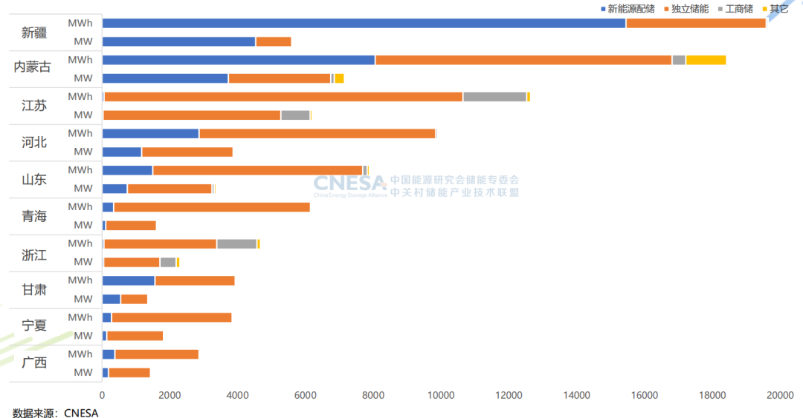 2024年中國新型儲能新增投運43.7GW/109.8GWh,同比增長+103%/+136%。從區(qū)域分布看,新疆和內(nèi)蒙古分列能量規(guī)模和功率規(guī)模第一,也是分別以新能源配儲和獨立儲能為主導(dǎo)的省份。