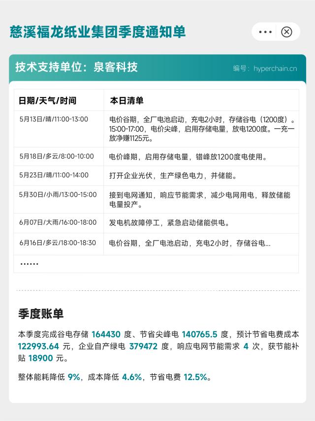 “我們這種能耗企業(yè),一開機就是全廠作業(yè),能耗非常大,電費也很貴,有時候出點故障一停工更是耽誤事兒,但是這個季度不一樣了!” 近日,慈溪福龍紙業(yè)集團工程小隊的隊長陳師傅“曬”出了工廠最新的季度賬單,巨大的轉(zhuǎn)變令他喜出望外。