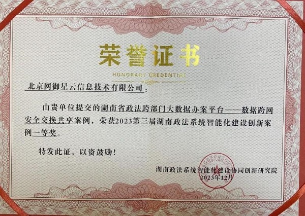 網(wǎng)御星云作為協(xié)辦單位受邀出席本次大會,公司申報的“湖南省政法跨部門大數(shù)據(jù)辦案平臺——數(shù)據(jù)跨網(wǎng)安全交換共享案例”榮獲2023第三屆湖南政法系統(tǒng)智能化建設創(chuàng)新案例一等獎!