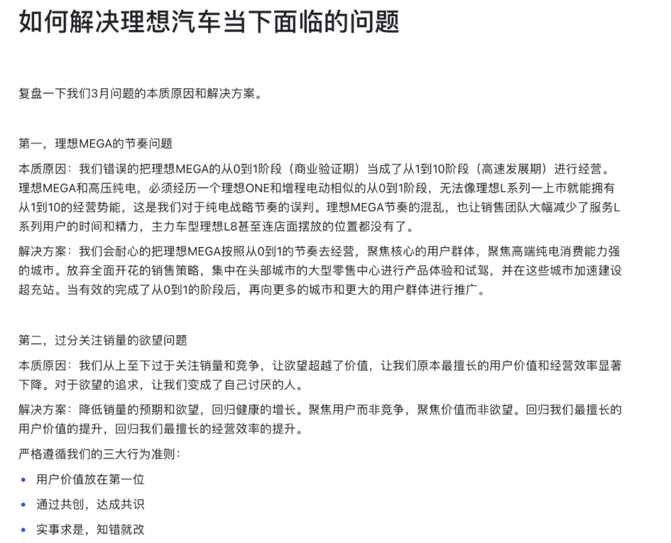如何解決理想汽車當(dāng)下面臨的問(wèn)題?李想在全員內(nèi)部信里表示,復(fù)盤了理想3月問(wèn)題的本質(zhì)原因和解決方案。