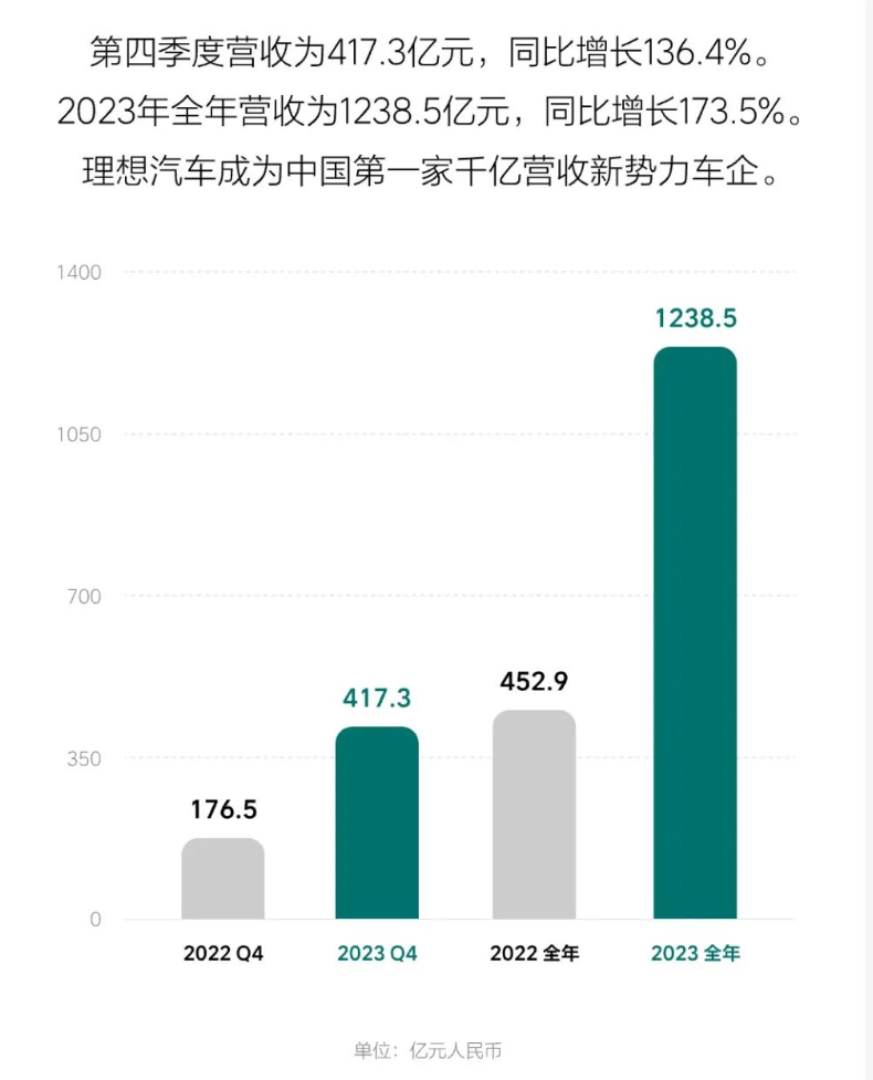 財(cái)報(bào)顯示,理想汽車2023年全年實(shí)現(xiàn)營(yíng)收1238.5億元,同比增長(zhǎng)173.5%,為國(guó)內(nèi)首家營(yíng)收突破千億元的新勢(shì)力車企。2023年凈利潤(rùn)為118.1億元,而2022年凈虧損20.3億元,實(shí)現(xiàn)了自交付以來(lái)的全面盈利,成為繼特斯拉、比亞迪之后全球第三家實(shí)現(xiàn)盈利的新能源車企。其中,2023年四季度凈利潤(rùn)為57.5億元,同比增長(zhǎng)2068.2%。