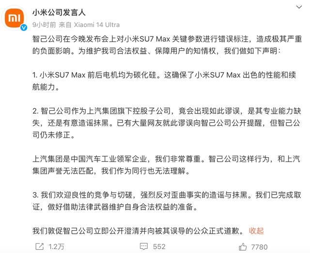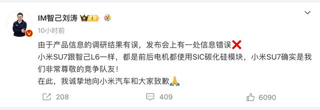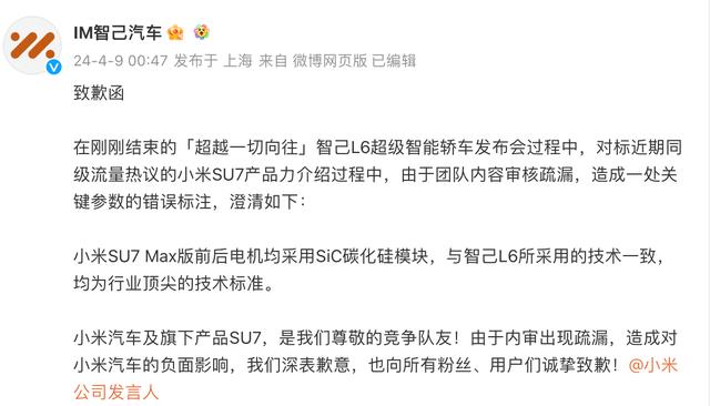 約半小時后,智己汽車終于在官方微博作出回應稱,在剛剛結束的智己L6超級智能轎車發(fā)布會過程中,對標近期同級流量熱議的小米SU7產(chǎn)品力介紹過程中,由于團隊內容審核疏漏,造成一處關鍵參數(shù)的錯誤標注,澄清如下:小米SU7 Max版前后電機均采用SIC碳化硅模塊,與智己L6所采用的技術一致,均為行業(yè)頂尖的技術標準,“小米汽車及旗下產(chǎn)品SU7,是我們尊敬的競爭隊友!由于內審出現(xiàn)疏漏,造成對小米汽車的負面影響,我們深表歉意,也向所有粉絲、用戶們誠摯致歉!”