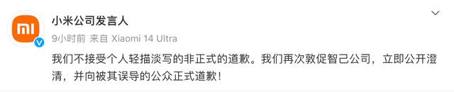 隨后小米公司發(fā)言人又針對前述劉濤的道歉補充說,“我們不接受個人輕描淡寫的非正式的道歉。我們再次敦促智己公司,立即公開澄清,并向被其誤導的公眾正式道歉!”