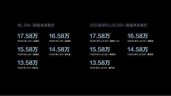 昨晚,搭載比亞迪第五代DM技術(shù)的宋L DM-i及2025款宋PLUS DM-i正式上市。兩款新車各推出5個版本,官方指導(dǎo)價均為13.58萬-17.58萬元。