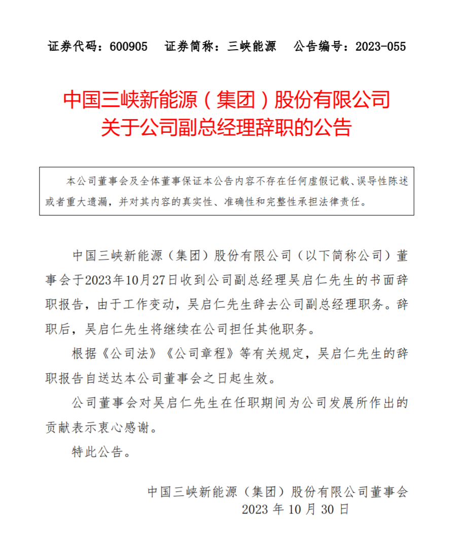 三峽能源10月30日公告稱,公司董事會(huì)于2023年10月27日收到副總經(jīng)理吳啟仁先生的書面辭職報(bào)告,由于工作變動(dòng),吳啟仁先生辭去公司副總經(jīng)理職務(wù)。辭職后,吳啟仁先生將繼續(xù)在公司擔(dān)任其他職務(wù)。