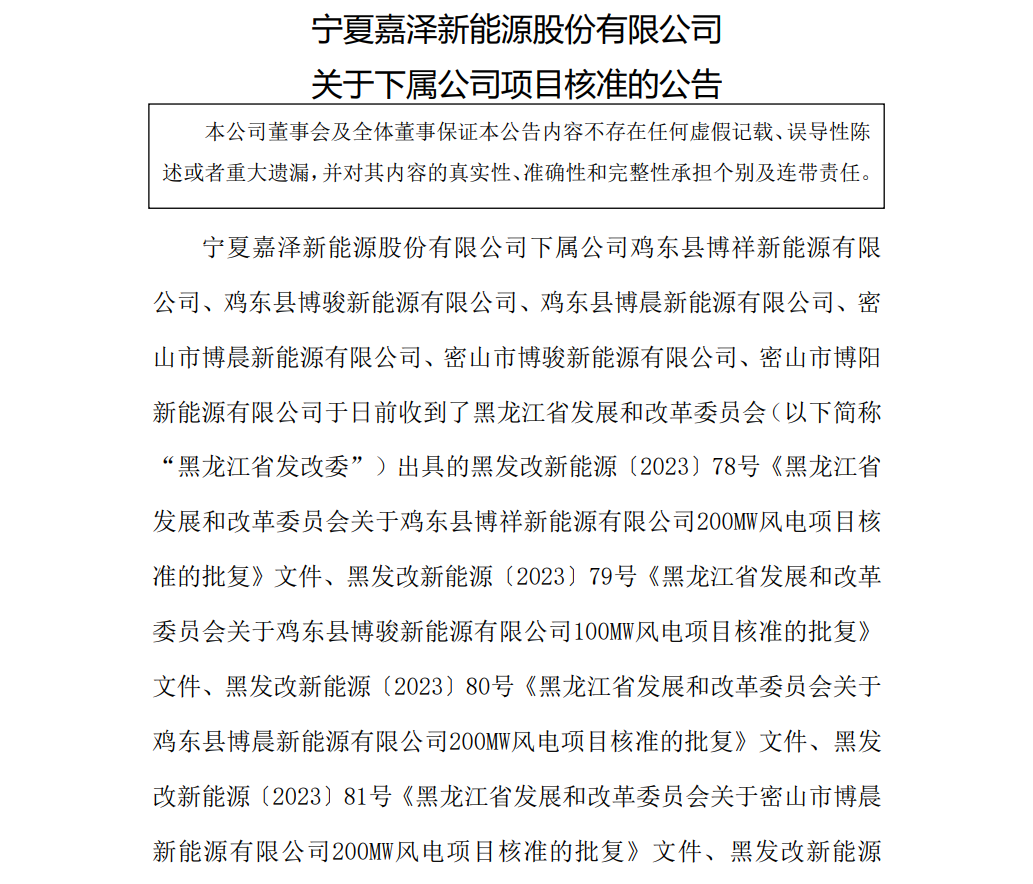 公告披露,寧夏嘉澤新能源股份有限公司下屬公司于日前收到了黑龍江省發(fā)展和改革委員會(以下簡稱“黑龍江省發(fā)改委”)出具的風電項目核準的批復文件,共計六個風電項目獲得核準,總裝機容量為1100MW。