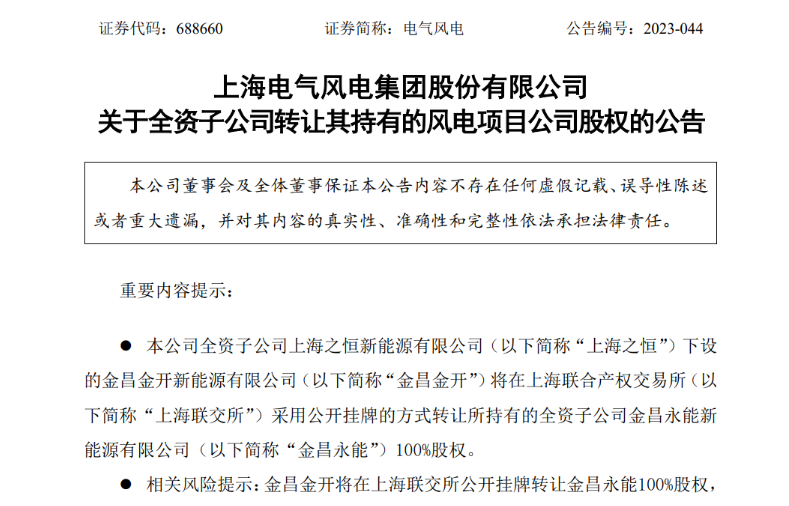 同日,電氣風(fēng)電發(fā)布《關(guān)于全資子公司轉(zhuǎn)讓其持有的風(fēng)電項(xiàng)目公司股權(quán)的公告》,電氣風(fēng)電全資子公司上海之恒下設(shè)的金昌金開(kāi)將在上海聯(lián)合產(chǎn)權(quán)交易所采用公開(kāi)掛牌的方式轉(zhuǎn)讓所持有的全資子公司金昌永能新能源有限公司(以下簡(jiǎn)稱“金昌永能”)100%股權(quán),金昌永能持有金昌風(fēng)電項(xiàng)目(裝機(jī)容量為100MW)。