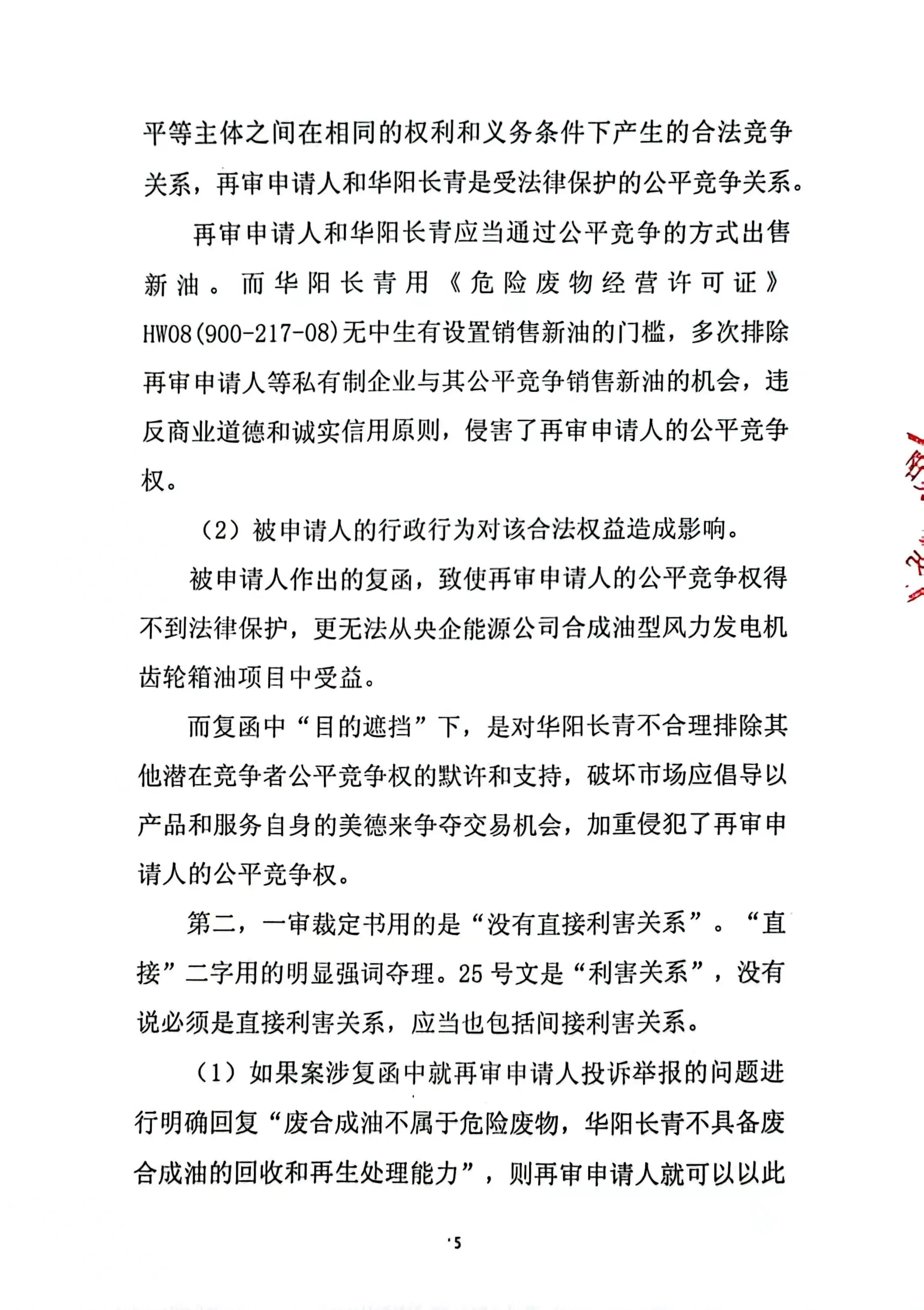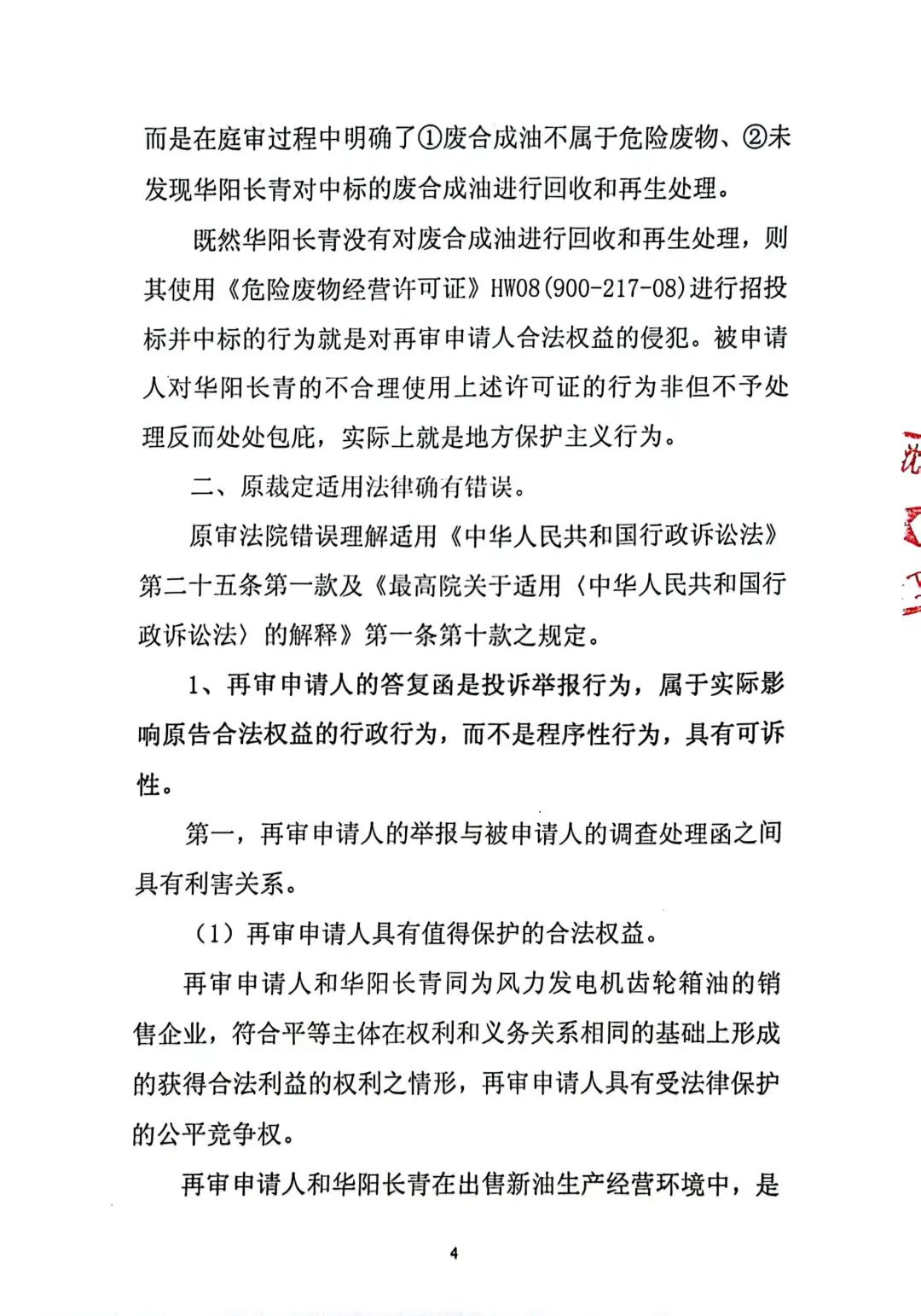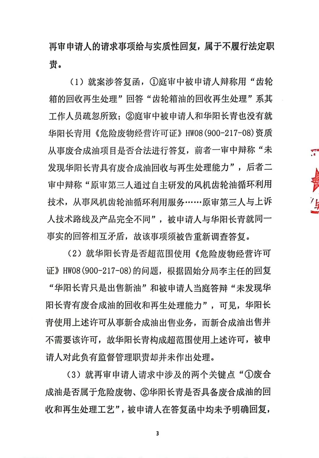 奧吉娜公司在再審申請中再次要求對兩個(gè)關(guān)鍵問題進(jìn)行法庭調(diào)查:1、《調(diào)查處理函》中的回答是錯(cuò)誤的。信陽市生態(tài)環(huán)境局依據(jù)《國家危險(xiǎn)廢物名錄(2021版)》認(rèn)定廢合成油不屬于危險(xiǎn)廢物,不需要《危險(xiǎn)廢物許可證》這種回答是錯(cuò)誤的,而且作為一個(gè)市級行政職能部門信陽市生態(tài)環(huán)境局也無權(quán)作出這種認(rèn)定。2、根據(jù)奧吉娜公司對目前廢合成型風(fēng)電潤滑油再生技術(shù)的了解,華陽長青公司不具備廢合成型風(fēng)電潤滑油的再生能力,所謂的再生處理存在造假和欺騙的嫌疑!