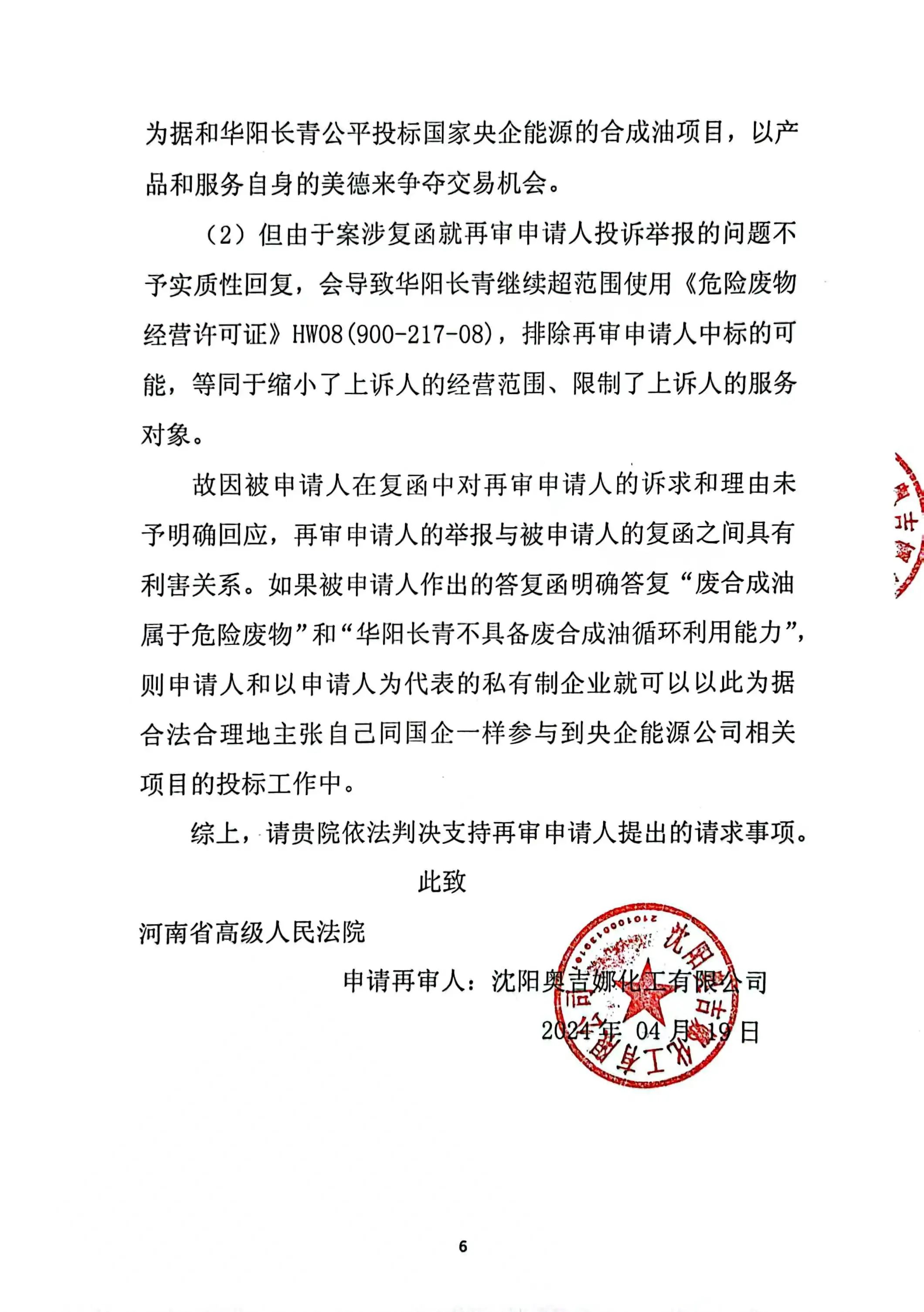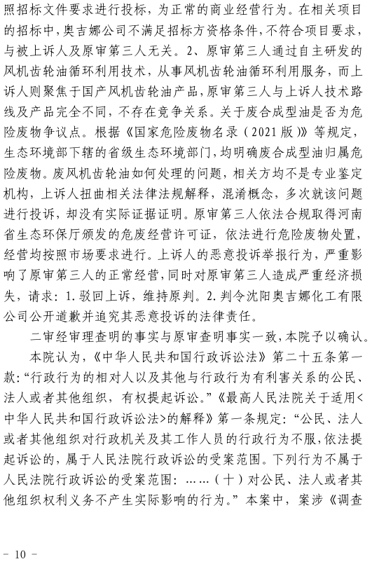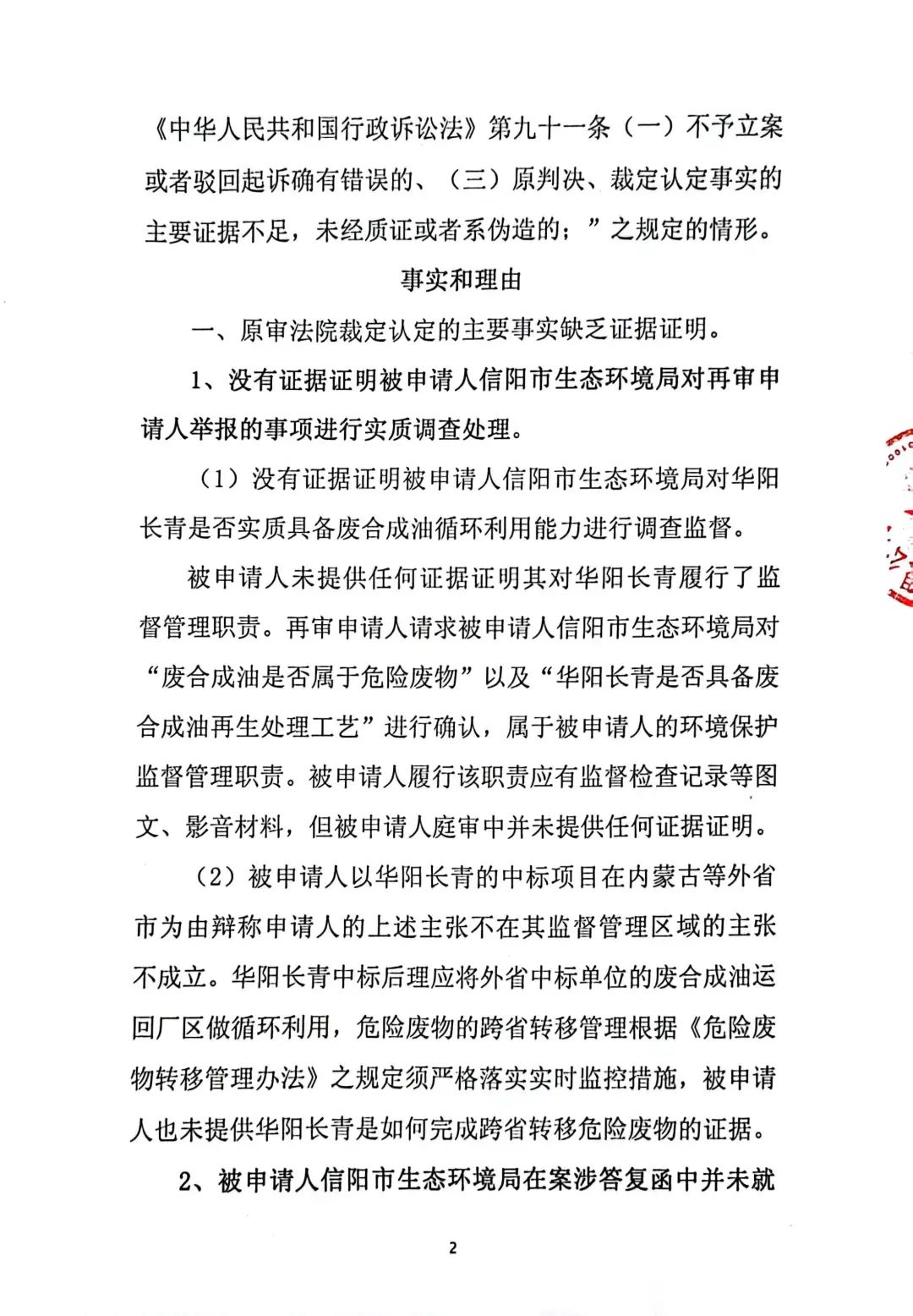 奧吉娜公司在再審申請中再次要求對兩個(gè)關(guān)鍵問題進(jìn)行法庭調(diào)查:1、《調(diào)查處理函》中的回答是錯(cuò)誤的。信陽市生態(tài)環(huán)境局依據(jù)《國家危險(xiǎn)廢物名錄(2021版)》認(rèn)定廢合成油不屬于危險(xiǎn)廢物,不需要《危險(xiǎn)廢物許可證》這種回答是錯(cuò)誤的,而且作為一個(gè)市級行政職能部門信陽市生態(tài)環(huán)境局也無權(quán)作出這種認(rèn)定。2、根據(jù)奧吉娜公司對目前廢合成型風(fēng)電潤滑油再生技術(shù)的了解,華陽長青公司不具備廢合成型風(fēng)電潤滑油的再生能力,所謂的再生處理存在造假和欺騙的嫌疑!