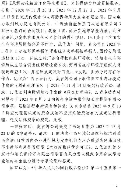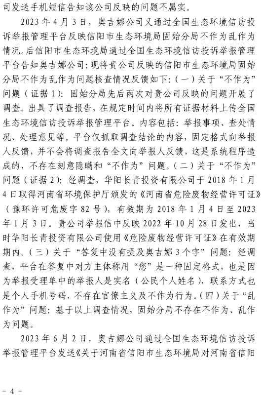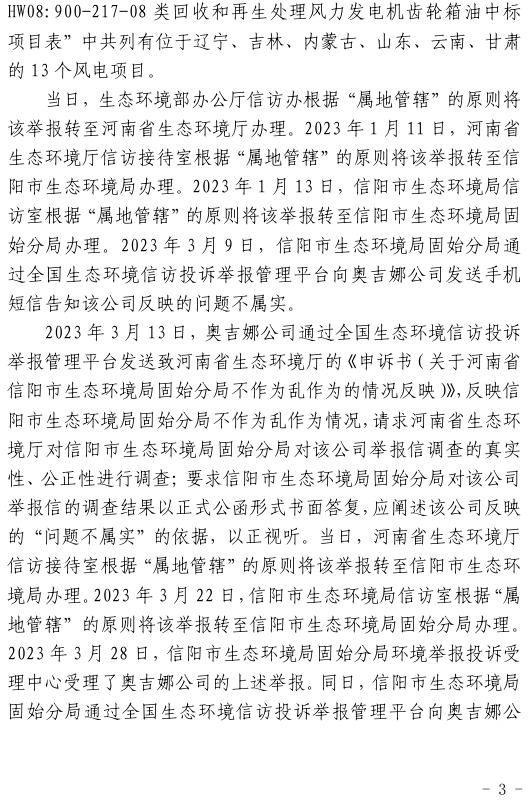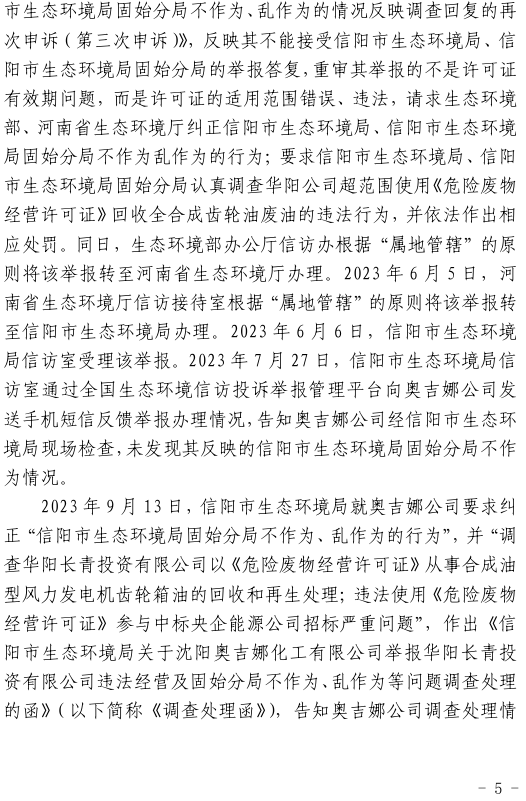 2023年3月9日,奧吉娜公司收到固始分局通過12369環(huán)境信訪平臺(tái)的短信答復(fù):“反映問題不屬實(shí)”。3月10日,奧吉娜公司向固始分局負(fù)責(zé)人電話詢問,其解釋稱:經(jīng)調(diào)查核實(shí),華陽長青公司沒有再生風(fēng)電潤滑油銷售,出售的是新油。否定了奧吉娜公司的舉報(bào)內(nèi)容。對此,奧吉娜公司表示強(qiáng)烈不滿。3月11日,奧吉娜公司向環(huán)境部投訴固始分局的不作為和亂作為。2023年5月26日,奧吉娜公司收到12369環(huán)境信訪平臺(tái)的短信答復(fù)。答復(fù)部門為信陽環(huán)境局。令人啼笑皆非的是,答復(fù)稱,華陽長青的許可證有效期沒有問題,與舉報(bào)內(nèi)容風(fēng)馬牛不相及。2023年6月13日,奧吉娜公司再次向環(huán)境部提出申訴,指出,奧吉娜舉報(bào)的不是許可證有效期問題,而是許可證的適用范圍錯(cuò)誤、違法。2023年7月27日,奧吉娜公司收到回復(fù)稱,經(jīng)信陽市生態(tài)環(huán)境局現(xiàn)場檢查,未發(fā)現(xiàn)固始分局不作為情況。2023年8月3日,奧吉娜公司向河南省生態(tài)環(huán)境廳(以下稱:環(huán)境廳)舉報(bào)信陽環(huán)境局包庇固始分局的行為。環(huán)境廳對此高度重視,有關(guān)處長和奧吉娜公司負(fù)責(zé)人進(jìn)行了面談。2023年9月13日,信陽環(huán)境局向奧吉娜公司致《信陽市生態(tài)環(huán)境局關(guān)于沈陽奧吉娜化工有限公司舉報(bào)華陽長青投資有限公司違法經(jīng)營及固始分局不作為、亂作為等問題調(diào)查處理的函》。函中:一是,以“齒輪箱”替換“齒輪箱油”,偷換概念;二是,做出了廢風(fēng)電合成(齒輪)油不屬于危險(xiǎn)廢物的結(jié)論;三是,未發(fā)現(xiàn)固始分局存在不作為、亂作為的不當(dāng)行為。再次否定奧吉娜公司的舉報(bào)和投訴。
