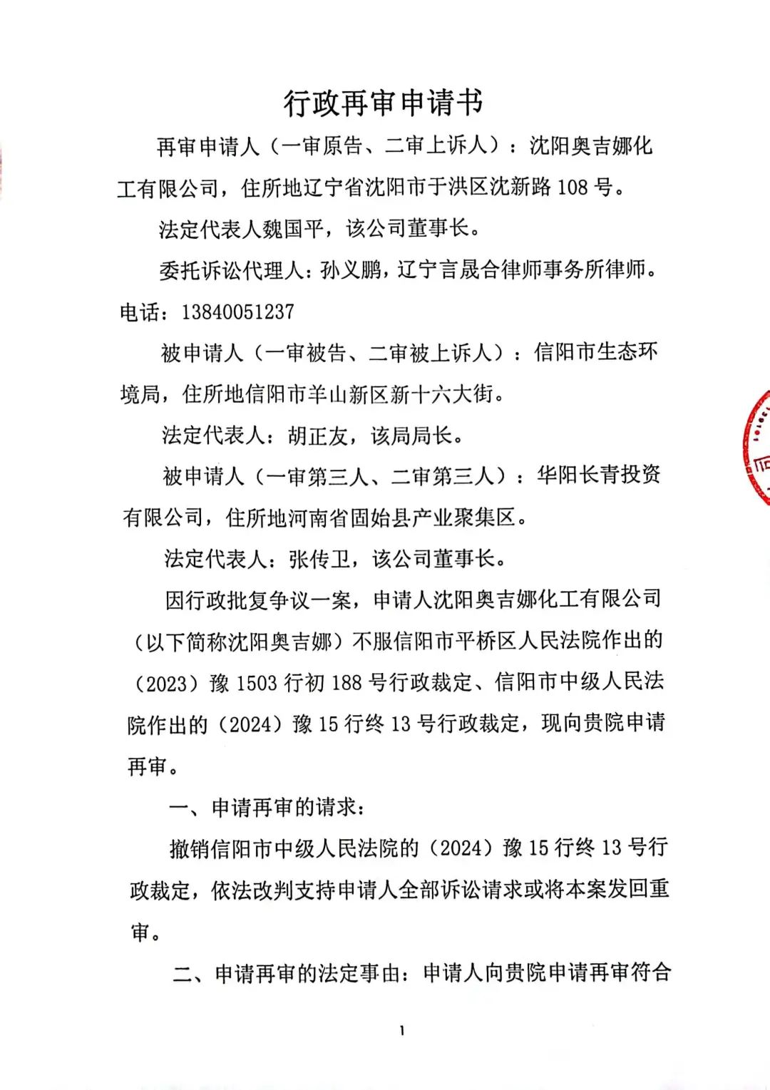2024年4月2日,河南省信陽市中級人民法院裁定:駁回上訴,維持原裁定[裁定書號(2024)豫15行終13號]。奧吉娜公司不服裁定,2024年4月19日向河南省高級人民法院遞交《行政再審申請書》,申請?jiān)賹彙?/p>