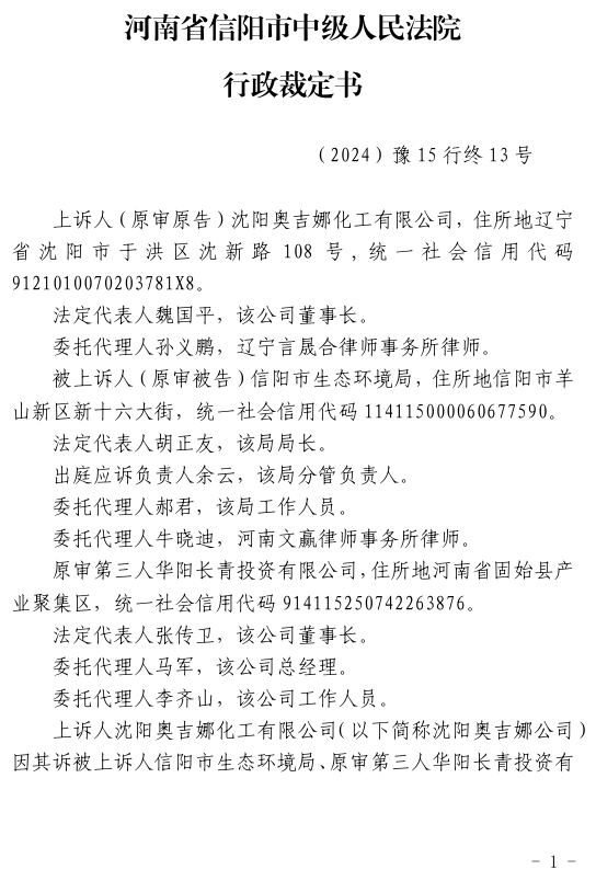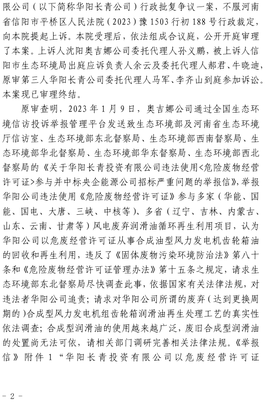 中國電力網(wǎng)訊  中國風(fēng)電潤滑油龍頭企業(yè)沈陽奧吉娜化工有限公司(下簡稱:奧吉娜公司或上訴人)訴信陽市生態(tài)環(huán)境局(被上訴人)和第三人華陽長青投資有限公司(下簡稱:華陽長青公司)行政訴訟案,河南省信陽市中級人民法院于2024年4月2日作出二審行政裁定:駁回上訴,維護(hù)原裁定。