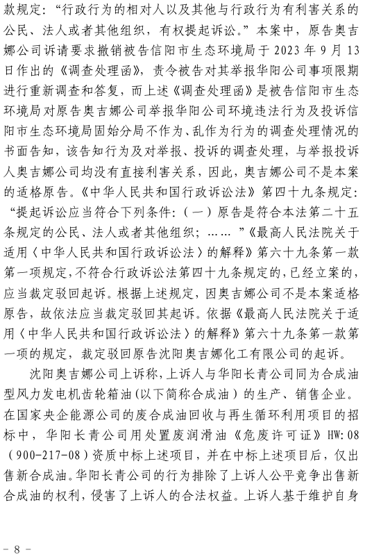 2023年10月18日,奧吉娜公司依據(jù)《行政訴訟法》和《行政訴訟法解釋》,將信陽市環(huán)境局和第三人華陽長青公司訴至信陽市平橋區(qū)人民法院,請求法院:1、判決撤銷被告作出的《信陽市生態(tài)環(huán)境局關(guān)于沈陽奧吉娜化工有限公司舉報(bào)華陽長青投資有限公司違法經(jīng)營及固始分局不作為、亂作為等問題調(diào)查處理的函》;2、責(zé)令被告針對原告于2023年8月3日向被告申訴舉報(bào)華陽長青投資有限公司事項(xiàng),限期進(jìn)行重新調(diào)查和答復(fù);3、請求人民法院判令被告2023年9月13日調(diào)查處理函認(rèn)定的廢合成油不應(yīng)按危險(xiǎn)廢物有關(guān)規(guī)定進(jìn)行管理,違反法律規(guī)章的規(guī)定,無效。