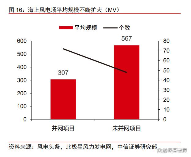 大型化和風電場規(guī)?;铀?,推動風機降本。大型化是海風降低單位 GW 成本的主要 途徑,大型風機單位功率對應的耗材更少,同時由于大型化后所需機組數量有效減少,可 顯著降低安裝及運維成本。根據明陽智能官網披露,以明陽智能 MySE12MW 半直驅海上 機組為例,在 1000MW 項目中,8MW 機組需要 125 臺,12MW 機組僅需 84 臺,節(jié)約用 海面積 30%以上,全場基礎成本降低 24%,塔筒成本降低 27%,經濟性凸顯。