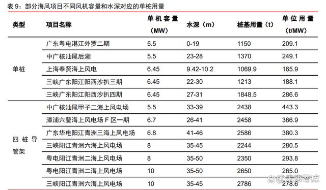 風電大型化和深?;苿訕痘⑺矄螜C用量增長。據海力風電招股書,適用于 0- 24m 水深單機容量 4MW 的單樁基礎重量在每臺 550-1000 噸之間;水深 30m 以上單機 容量 5MW 使用的四樁導管架基礎重量為 243 噸。以三峽陽江沙扒三期和三峽陽江青洲六 項目對比測算樁基塔筒單機用量,陽江沙扒三期安裝單機容量 6.45MW 風機 62 臺,陽江 青洲六分別安裝 8MW 和 10MW 容量風機 25 和 80 臺,風機葉片直徑、輪轂高度數值均增 大,單臺塔筒和樁基用量為 734 噸和 2657 噸,較淺水域小容量風機項目對應的 380 噸和 1693 噸用量提升。