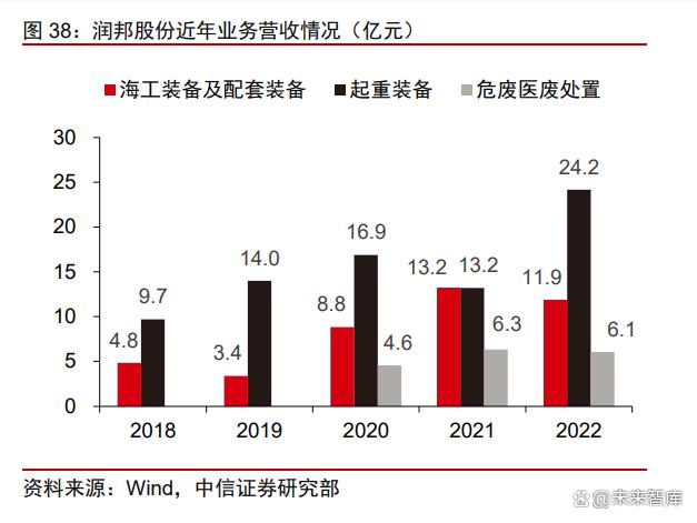 業(yè)務(wù)線豐富,布局高端裝備和環(huán)保板塊。公司主營(yíng)業(yè)務(wù)分為包括海風(fēng)裝備、物料搬運(yùn) 裝備的高端裝備業(yè)務(wù)和包含危廢及醫(yī)廢處理處置服務(wù)的環(huán)保業(yè)務(wù)。2022 年公司海風(fēng)裝備、 起重裝備、危廢醫(yī)廢處置業(yè)務(wù)分別營(yíng)收 11.89、24.17、6.07 億元,占比 22.97%、46.71%、 11.73%。公司海上風(fēng)電裝備業(yè)務(wù)主要產(chǎn)品包括各類(lèi)海上風(fēng)電基礎(chǔ)樁、導(dǎo)管架、海上風(fēng)電安 裝作業(yè)平臺(tái)、海洋工程起重機(jī)等。