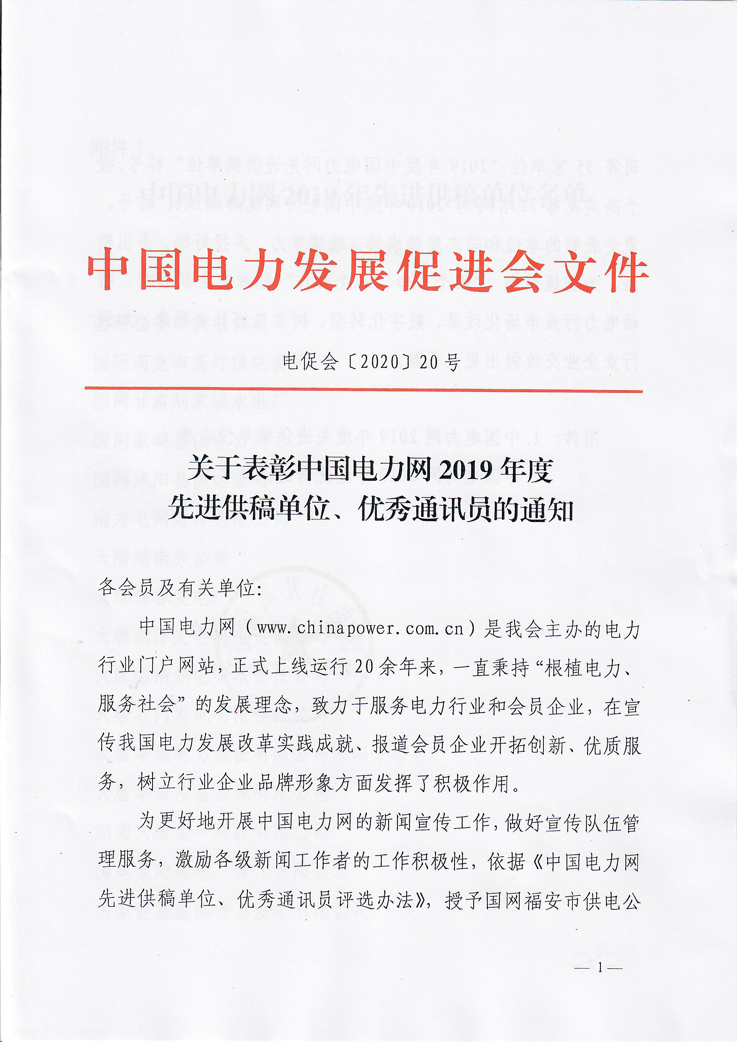 關(guān)于表彰中國電力網(wǎng)2019年度先進(jìn)供稿單位、優(yōu)秀通訊員的通知
