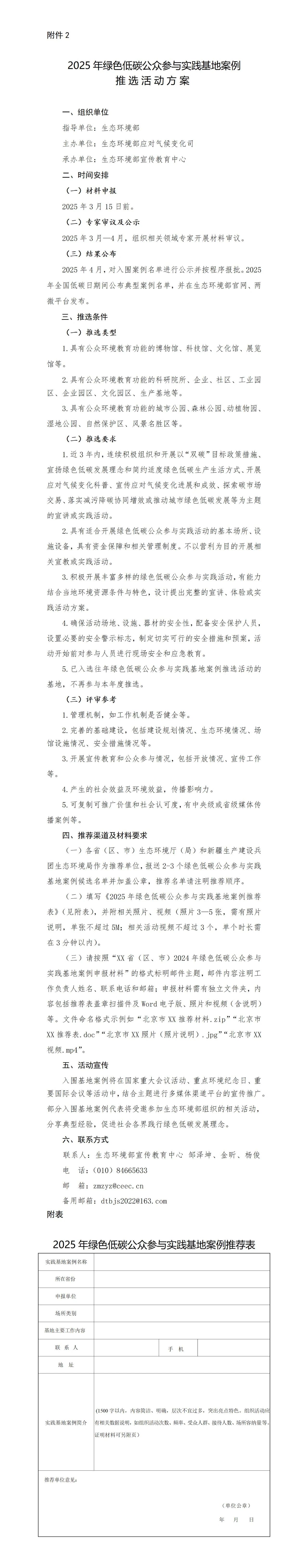 現(xiàn)將《2025年綠色低碳典型案例征集推選活動方案》《2025年綠色低碳公眾參與實踐基地案例推選活動方案》印發(fā)給你們,請認(rèn)真做好組織動員工作,并按方案要求報送相關(guān)材料。