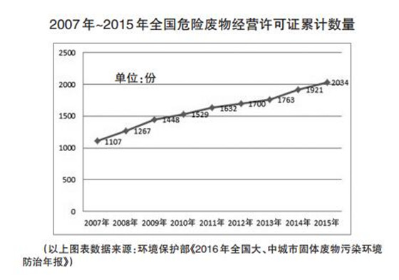 環(huán)境保護(hù)部近日公布的《2016年全國大、中城市固體廢物污染環(huán)境防治年報(bào)》(以下簡稱《2016年報(bào)》)顯示,全國危險(xiǎn)廢物處理能力明顯提高,截至2015年底,各省(區(qū)、市)累計(jì)頒發(fā)的危險(xiǎn)廢物(含醫(yī)療廢物)經(jīng)營許可證共2034份,比2014年增加113份,全國危險(xiǎn)廢物經(jīng)營單位核準(zhǔn)危廢處理能力達(dá)5263萬噸/年,較同期提高959萬噸/年。