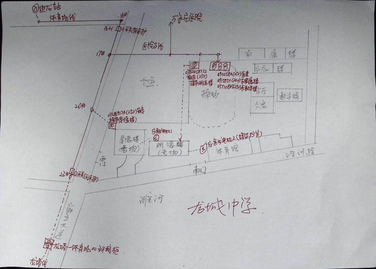 諸城市龍城中學(xué)建校于1998年,隨著學(xué)校的發(fā)展,校園規(guī)模逐步擴(kuò)大,供電變壓器也越來(lái)越多,且較為分散。該用戶現(xiàn)有配變5臺(tái)、總?cè)萘?200千伏安,電源全部來(lái)自110千伏迪龍站10千伏體育場(chǎng)線。對(duì)此,該校用電出現(xiàn)了電源點(diǎn)單一、供電可靠性相對(duì)不高,配變數(shù)量多且分散的特殊情況。為了熟練掌握龍城中學(xué)供電基本情況,確保高考保供電萬(wàn)無(wú)一失,該公司舜王供電所工作人員多次現(xiàn)場(chǎng)勘查,手工繪制了該校區(qū)的供電網(wǎng)絡(luò)平面圖。該圖簡(jiǎn)要繪制了龍城中學(xué)的建筑平面布置圖,標(biāo)明了考場(chǎng)等重要負(fù)荷位置;涵蓋了龍城中學(xué)高壓電源走向圖、線路結(jié)構(gòu)和標(biāo)明T接點(diǎn)位置;明確了用戶5臺(tái)配變的分布位置和供電區(qū)域;綜合考慮接入線路和噪音影響,明確了供電公司保供電應(yīng)急發(fā)電機(jī)的安裝和接入位置等。