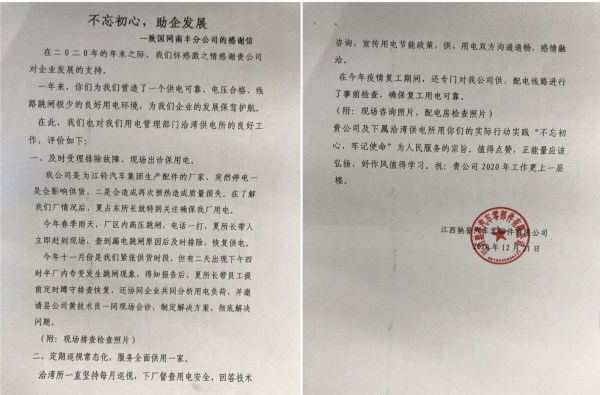 中國電力網(wǎng)訊 12月21日,國網(wǎng)南豐縣供電公司收到江西馳譽(yù)汽車零部件有限公司送來的感謝信,對該公司提供的良好用電環(huán)境表示衷心感謝。