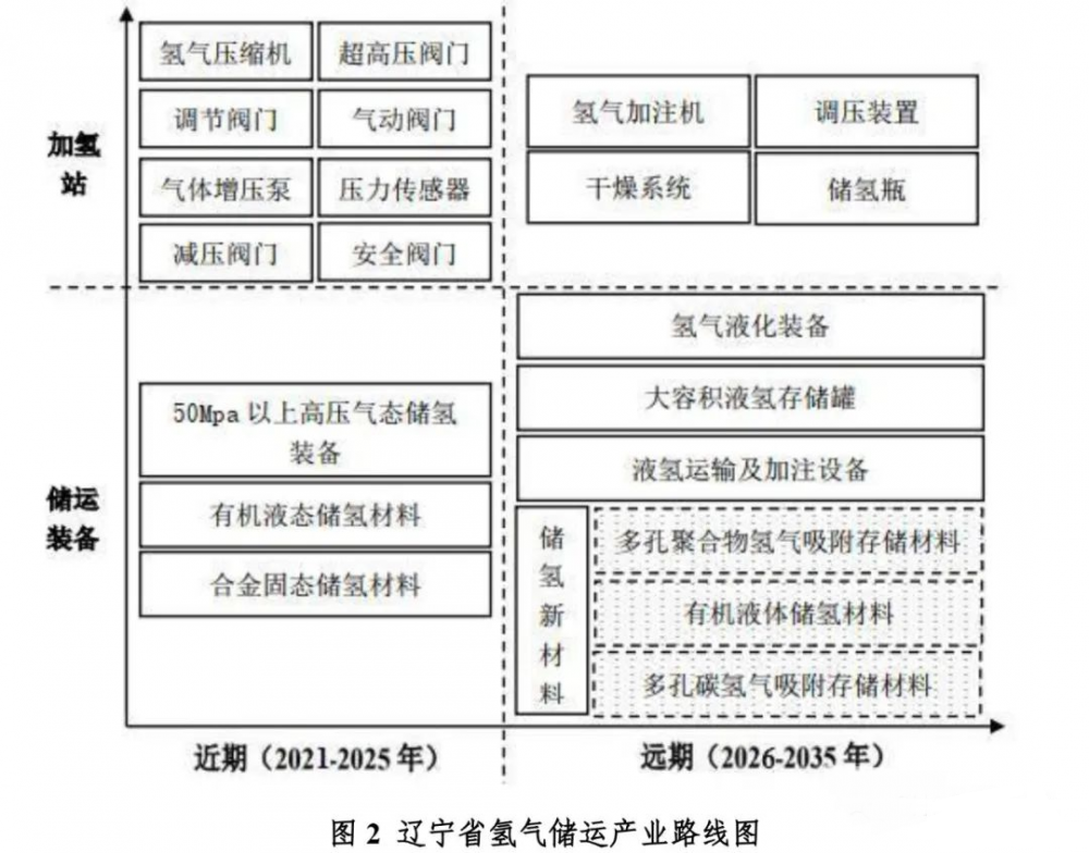近期(2021-2025年),重點發(fā)展50兆帕以上高壓氣態(tài)儲氫裝備和低溫液態(tài)儲氫裝備,同時開展有機液態(tài)儲氫、合金固態(tài)儲氫等儲氫材料的研發(fā)和生產(chǎn)。遠期(2026-2035年),積極發(fā)展氫氣液化裝備、大容積液氫存儲罐、液氫運輸及加注設(shè)備等儲氫裝備,同時開展有機液體儲氫材料、多孔碳氫氣吸附存儲材料、多孔聚合物氫氣吸附存儲材料的研發(fā)和生產(chǎn)。