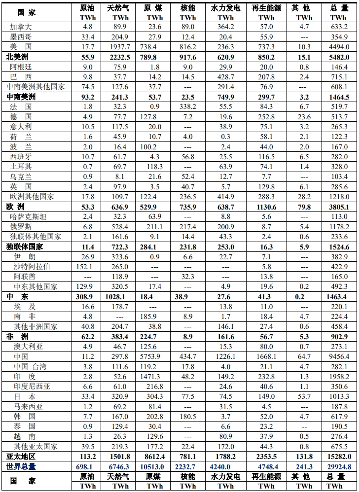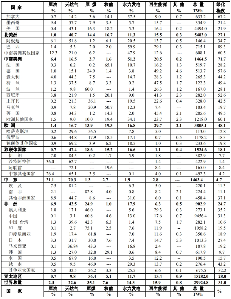 電力結(jié)構(gòu)是指電力來(lái)自一次能源的比例,由于各國(guó)所處的地理位置不同,資源貧富程度各不相同,甚至相差甚遠(yuǎn),這就構(gòu)成了世界各國(guó)各不相同的電力結(jié)構(gòu)。為了全面理解各個(gè)國(guó)家的電力結(jié)構(gòu),本文采用兩種形式來(lái)表示:⑴ 用各國(guó)一次能源生產(chǎn)的電力(TWh)來(lái)表示;⑵ 將各國(guó)一次能源生產(chǎn)的電力化為百分率來(lái)觀察電力綠化程度。