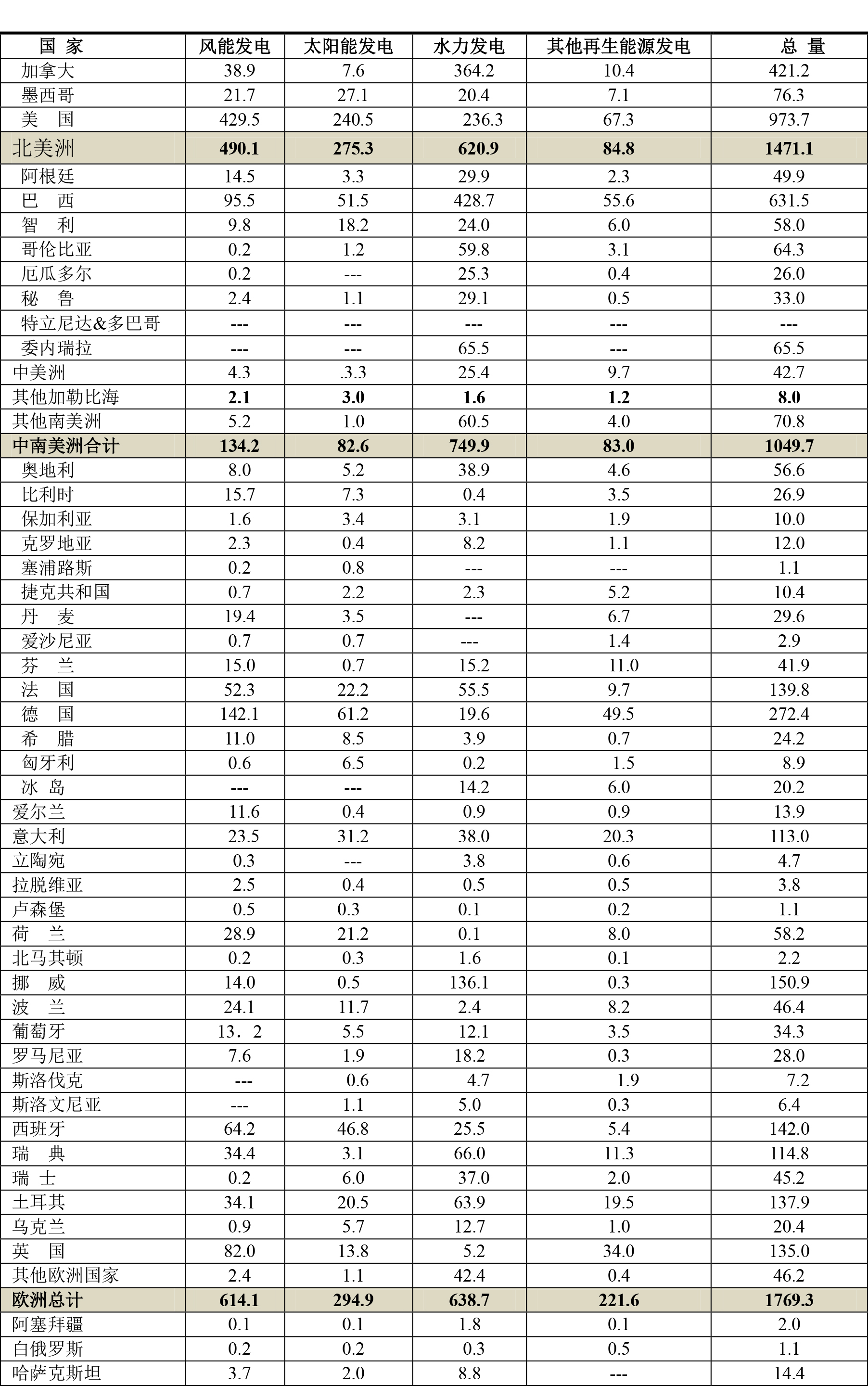 (風能發(fā)電+太陽能發(fā)電+其他再生能源發(fā)電)=“世界各國電力結(jié)構(gòu)分析表1”的再生能源