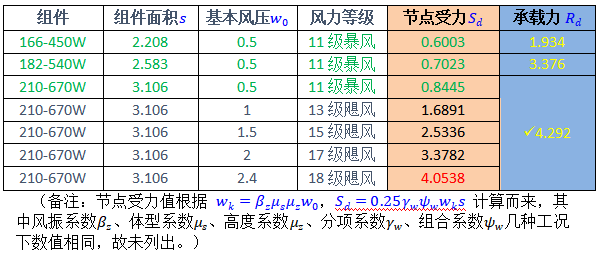 再以青海省作為項(xiàng)目實(shí)例說明,取全省最大基本風(fēng)壓0.5kN/m2為計(jì)算值,參考規(guī)范GB5009-2012《荷載規(guī)范》、GB 50429-2007 《鋁合金結(jié)構(gòu)設(shè)計(jì)規(guī)范》、NB/T10115-2018《光伏支架結(jié)構(gòu)設(shè)計(jì)規(guī)程》可知,全省范圍內(nèi)節(jié)點(diǎn)處作用力遠(yuǎn)小于組件連接處承載力,三款參考組件都處于安全狀態(tài)。(下表綠色數(shù)字部分)