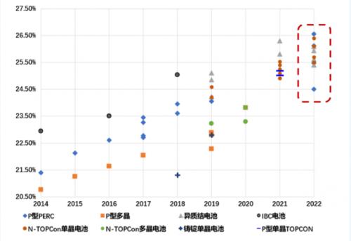 在內(nèi)外部環(huán)境的共同推動下,我國光伏企業(yè)加大工藝技術(shù)研發(fā)力度,生產(chǎn)工藝水平不斷進步,不斷刷新紀(jì)錄。據(jù)中國光伏行業(yè)協(xié)會統(tǒng)計,2014—2022年,我國企業(yè)、研究機構(gòu)晶硅電池實驗室效率共打破世界紀(jì)錄56次;2022年,刷新效率紀(jì)錄14次,其中10次為n型電池技術(shù)。未來隨著生產(chǎn)成本的降低及良率的提升,n型電池將會成為電池技術(shù)的主要發(fā)展方向之一。
