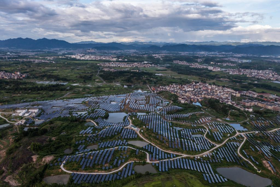 7月6日,從空中俯瞰位于東陽市六石街道夏溪潭村附近的50兆瓦農(nóng)光互補(bǔ)光伏發(fā)電項目(無人機(jī)照片)。該項目總投資3.7億元,占地面積約1700畝,年發(fā)電量2500萬千瓦時。