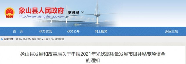 7月5日,浙江象山縣發(fā)展和改革局關于申報2021年光伏高質量發(fā)展市級補貼專項資金的通知發(fā)布。
