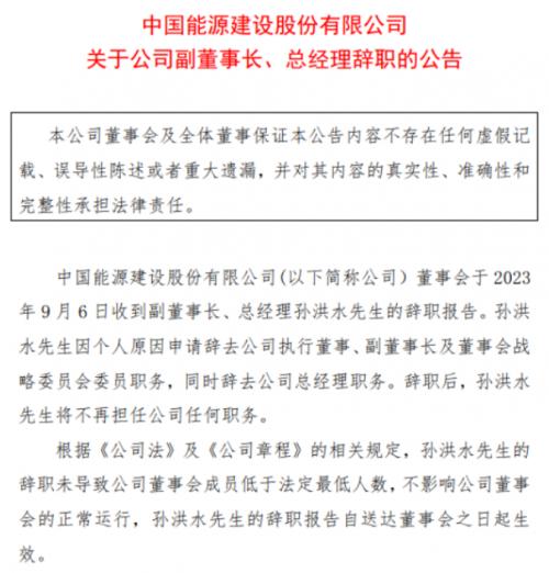 2023年9月6日,中國能建公告,孫洪水辭職,將不再擔任公司任何職務。