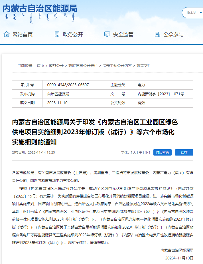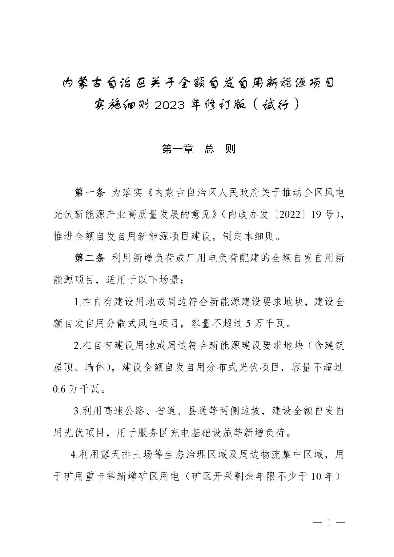 日前,內(nèi)蒙古自治區(qū)能源局官網(wǎng)發(fā)布內(nèi)蒙古自治區(qū)關(guān)于全額自發(fā)自用新能源項目實施細則 2023 年修訂版(試行)。