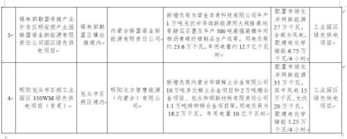 (四)明陽包頭市石拐工業(yè)園區(qū)350WM綠色供電項目。此本項目為變更項目,新增負(fù)荷內(nèi)蒙古華商稀土合金有限公司10萬噸多元稀土合金項目和2萬噸硼合金項目、包頭和順新材料有限責(zé)任公司1.1萬噸特種特合金項目等,用電負(fù)荷為18.2萬千瓦,年用電量10億千瓦時。配置市場化并網(wǎng)新能源35萬千瓦,其中風(fēng)電15萬千瓦、光伏20萬千瓦,配建電化學(xué)儲能5.25萬千瓦/4小時。
