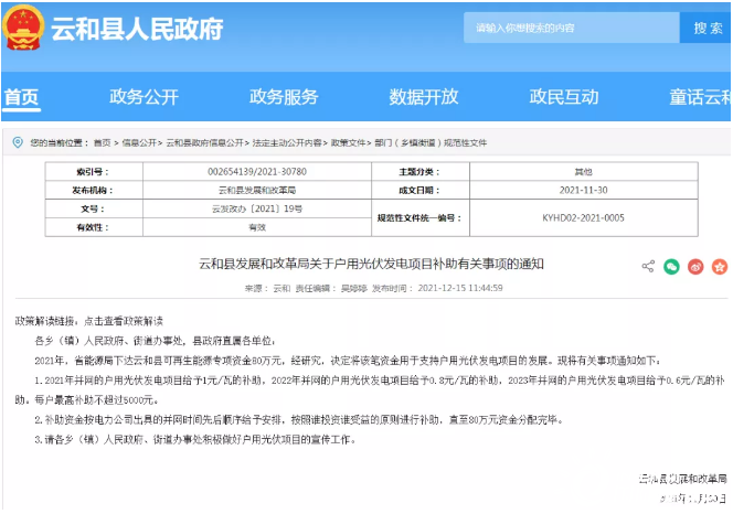 《通知》指出,2021年,省能源局下達云和縣可再生能源專項資金80萬元,經(jīng)研究,決定將該筆資金用于支持戶用光伏發(fā)電項目的發(fā)展。
