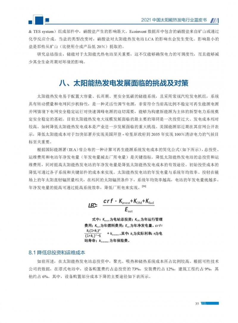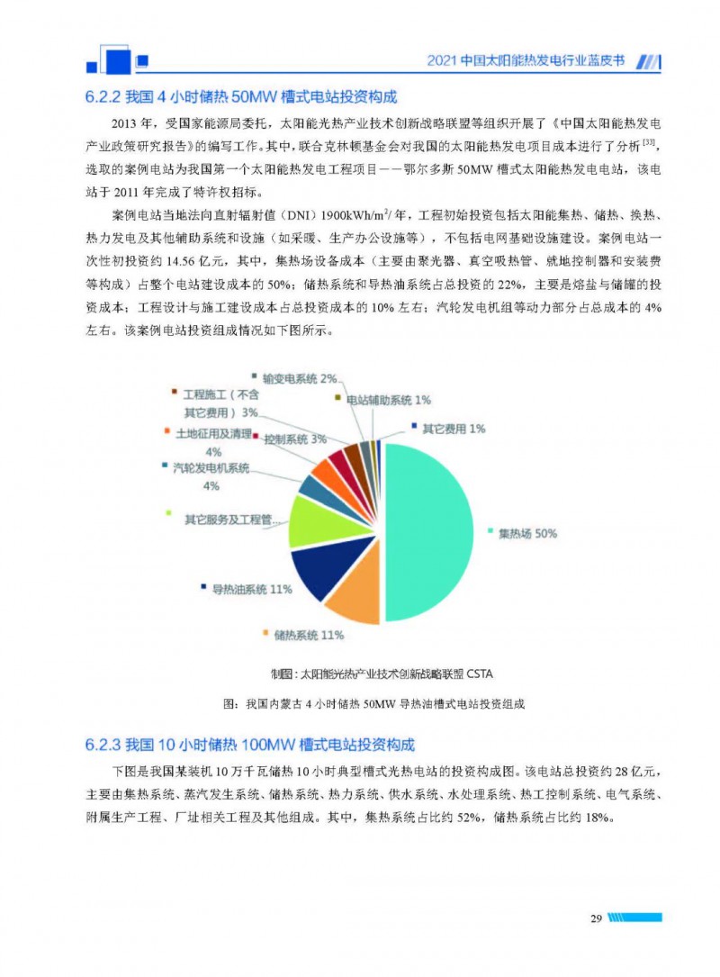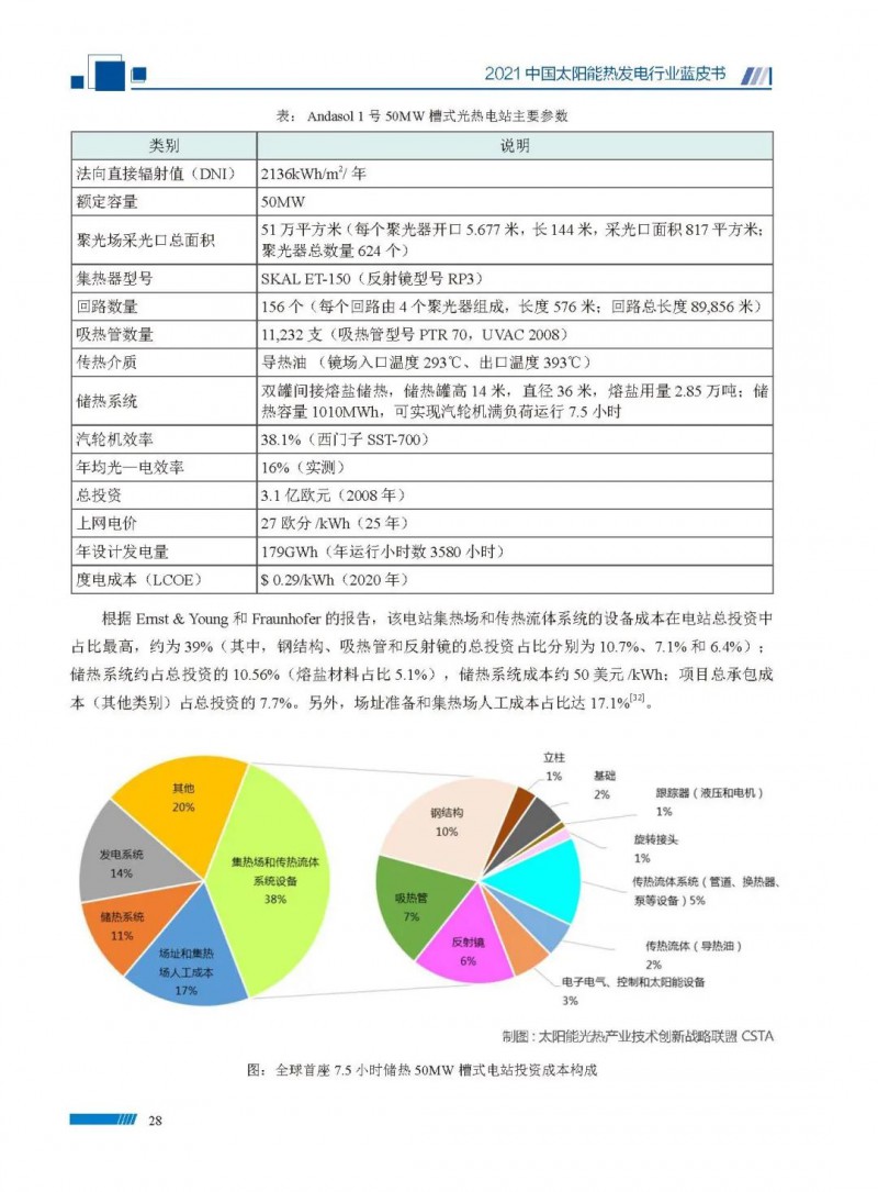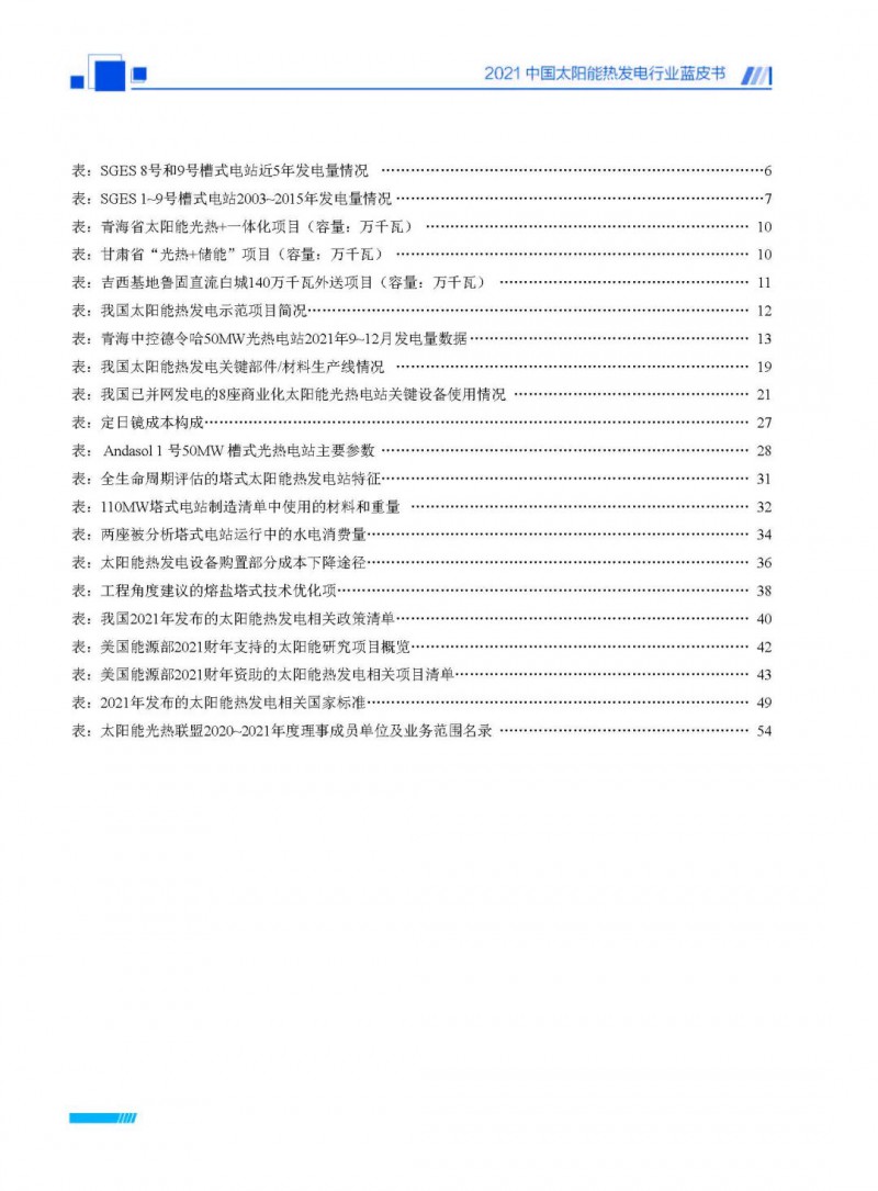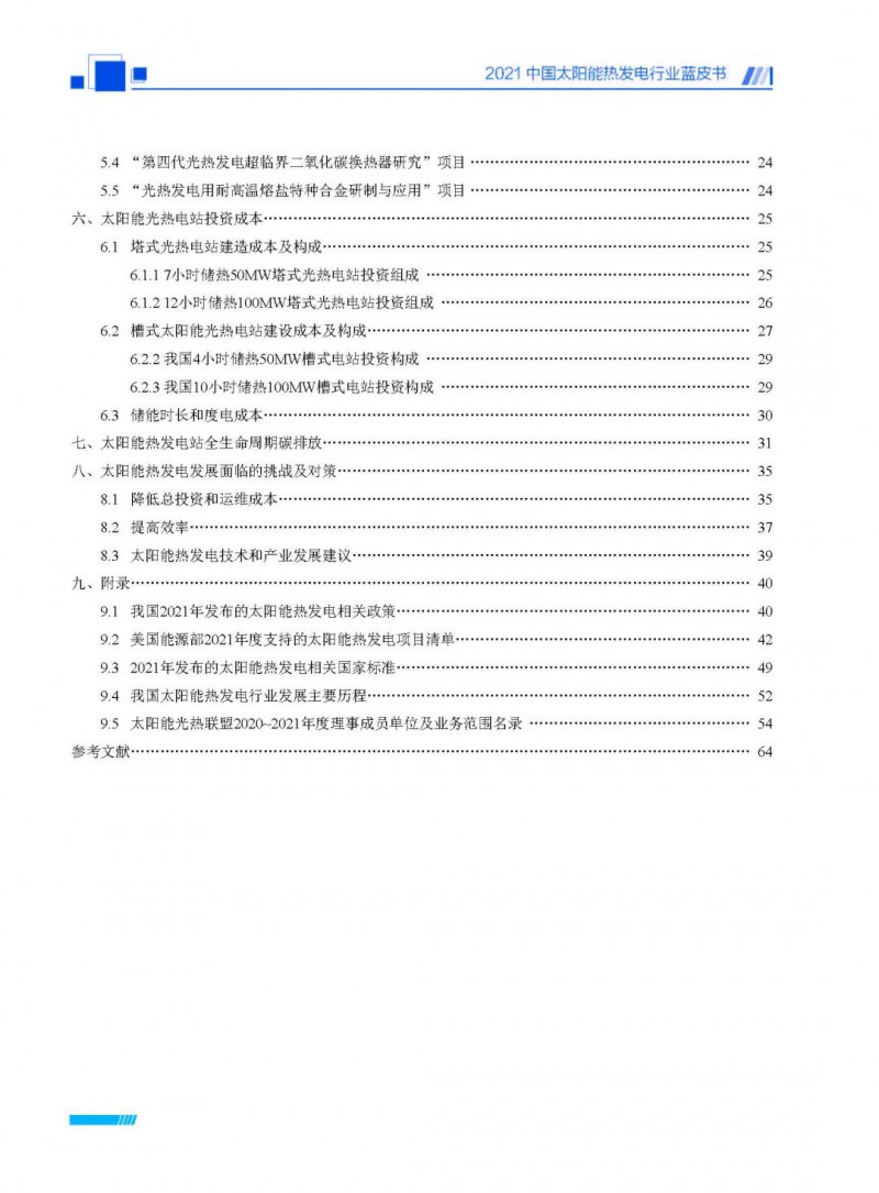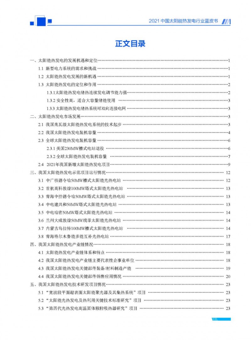 2021中國太陽能熱發(fā)電行業(yè)藍皮書(以下簡稱“藍皮書”)共分為9個章節(jié),分別為:太陽能熱發(fā)電的發(fā)展機遇和定位、太陽能熱發(fā)電市場發(fā)展、我國太陽能熱發(fā)電示范項目運行情況、我國太陽能熱發(fā)電產(chǎn)業(yè)鏈情況、我國太陽能熱發(fā)電研發(fā)項目情況、太陽能熱發(fā)電投資成本、太陽能熱發(fā)電站全生命周期碳排放、太陽能熱發(fā)電發(fā)展面臨的挑戰(zhàn)及對策,以及附錄。附錄主要包括:我國2021年發(fā)布的太陽能熱發(fā)電項目政策、美國能源部2021年度支持的太陽能熱發(fā)電項目清單、2021年發(fā)布的太陽能熱發(fā)電相關(guān)國家標準、我國太陽能熱發(fā)電行業(yè)發(fā)展主要歷程、太陽能光熱聯(lián)盟理事成員單位及業(yè)務范圍名錄。全文4.5萬+字,共55張圖表。