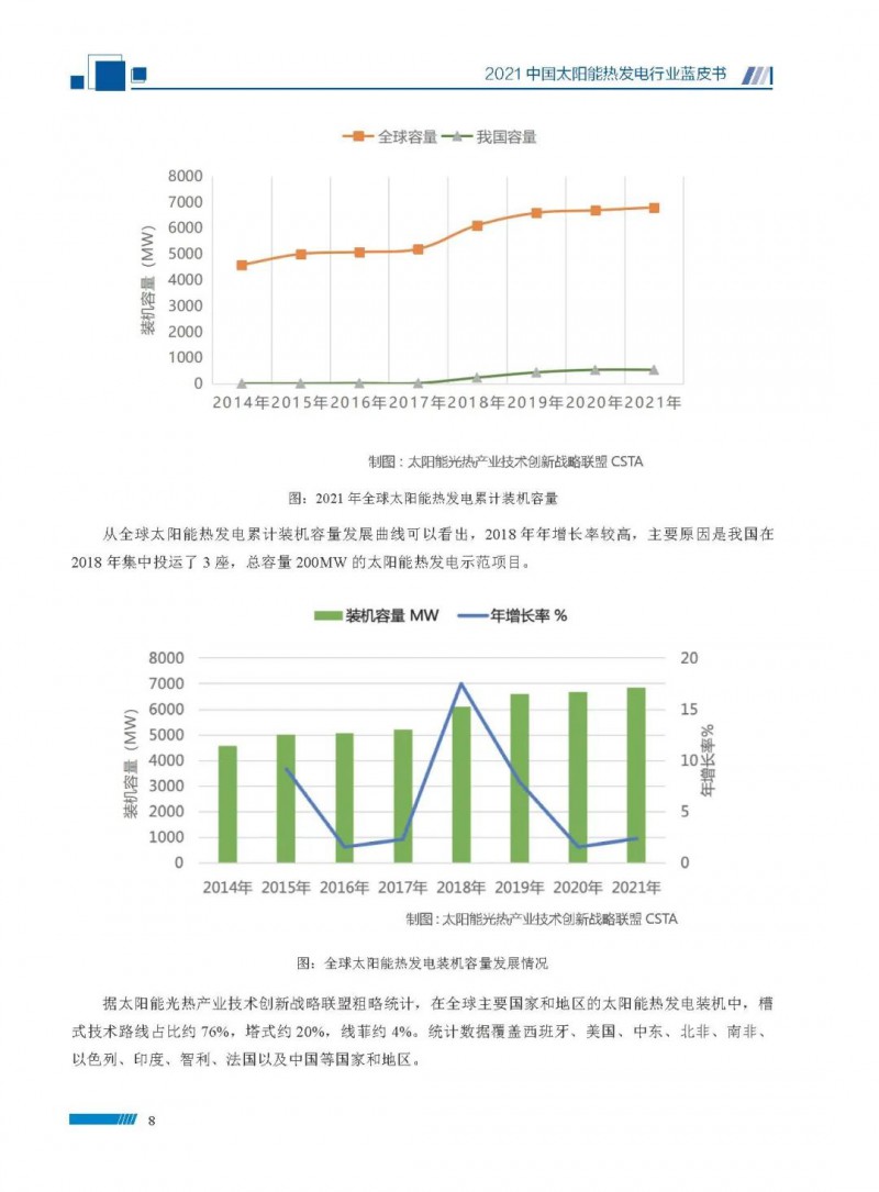 近日,由國家太陽能光熱產(chǎn)業(yè)技術(shù)創(chuàng)新戰(zhàn)略聯(lián)盟、中國可再生能源學會太陽能熱發(fā)電專業(yè)委員會、中關(guān)村新源太陽能熱利用技術(shù)服務中心聯(lián)合編制的《2021中國太陽能熱發(fā)電行業(yè)藍皮書》發(fā)布。