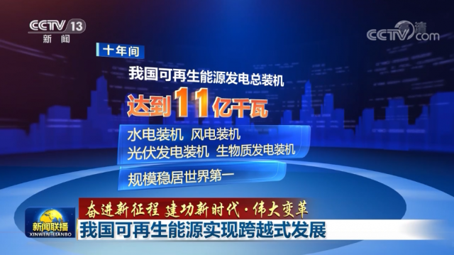 十年間,我國(guó)可再生能源發(fā)電總裝機(jī)達(dá)到11億千瓦,水電、風(fēng)電、光伏發(fā)電、生物質(zhì)發(fā)電裝機(jī)規(guī)模穩(wěn)居世界第一。其中,風(fēng)電光伏并網(wǎng)裝機(jī)合計(jì)6.7億千瓦,是2012年的近90倍。
