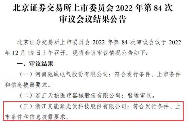 12月19日晚間,北京證券交易所上市委員會2022年第84次審議會議結(jié)果出爐,浙江艾能聚光伏科技股份有限公司(簡稱“艾能聚”)符合發(fā)行條件、上市條件和信息披露要求,成功過會。