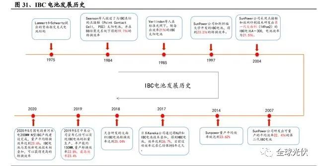 IBC 電池發(fā)展歷史:IBC 電池早最是由 Lammert 和 Schwartz 在 1975 年提出 的背面指交叉式電池結(jié)構(gòu)。美國的 Sunpower 公司是 IBC 電池的領(lǐng)軍者和開拓者, 2014 年其量產(chǎn)平均效率就達(dá)到 23.62%,2015 年實驗室效率達(dá)到 25.2%;2018 年 天合研發(fā)的大面積 IBC 電池轉(zhuǎn)換效率達(dá)到 25.04%;2019 年 5 月中來公司宣布已 經(jīng)可以實現(xiàn) IBC 電池的批量生產(chǎn),年產(chǎn)能約 150MW,量產(chǎn)轉(zhuǎn)換效率 22.8%,最高效率 23.4%。2020 年 5 月國電投黃河水電 200MW N 型 IBC 產(chǎn)線建設(shè)完成,量產(chǎn)平均轉(zhuǎn)換效率達(dá)到 23.6%。IBC 電池與其他新電池技術(shù)相疊加,可以獲得更高的 轉(zhuǎn)換效率,2017 年 3 月,日本 Kaneka 公司通過將 HJT 和 IBC 電池技術(shù)疊加,得 到 HBC 電池,效率達(dá)到 26.7%,目前這項效率記錄已經(jīng)保持 5 年之久。