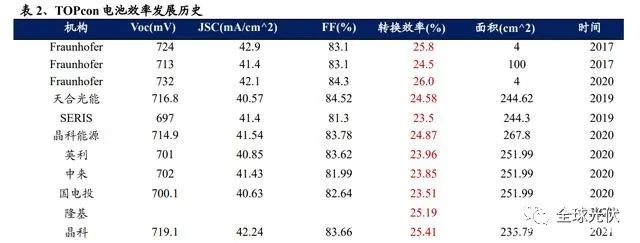 發(fā)展歷史:2013 年德國 Fraunhofer 研究所在 N 型 PERT 結(jié)構(gòu)基礎(chǔ)上,首次提 出 TOPCon 結(jié)構(gòu);2017 年 Fraunhofer 研究所在實驗室 TOPcon 電池上取得 25.8% 的效率記錄;2019 年,天合光能在面積為 244.62 平方厘米的 n 型襯底上制備出 正面最高效率為 24.58%的實驗室電池,并獲德國哈梅林太陽能研究所(ISFH) 下屬的檢測實驗室認(rèn)證,同年,天合光能 i-TOPCon 雙面電池大規(guī)模量產(chǎn)正面平 均轉(zhuǎn)換效率突破 23%。2021 年,晶科能源 TOPcon 電池在權(quán)威第三方測試認(rèn)證機 構(gòu)日本 JET 檢測實驗室標(biāo)定全面積電池最高轉(zhuǎn)化效率達(dá)到 25.4%,成為商業(yè)化全 面積電池效率記錄的保持者,為后續(xù)的 N 型 TOPCon 電池的擴產(chǎn)奠定基礎(chǔ)。