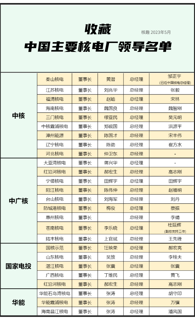 | 陽江核電 | 董事長 | 陳偉仲(退休) | 總經(jīng)理 | 趙福明 |