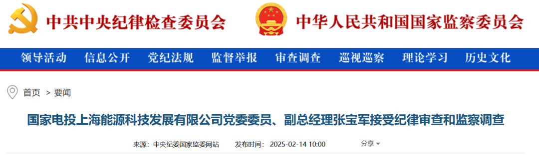 中央紀(jì)委國家監(jiān)委網(wǎng)站2月14日消息,據(jù)國家電投紀(jì)檢監(jiān)察組、山西省紀(jì)委監(jiān)委消息:國家電投上海能源科技發(fā)展有限公司黨委委員、副總經(jīng)理張寶軍涉嫌嚴(yán)重違紀(jì)違法,目前正接受國家電投紀(jì)檢監(jiān)察組和山西省長治市監(jiān)委紀(jì)律審查和監(jiān)察調(diào)查。
