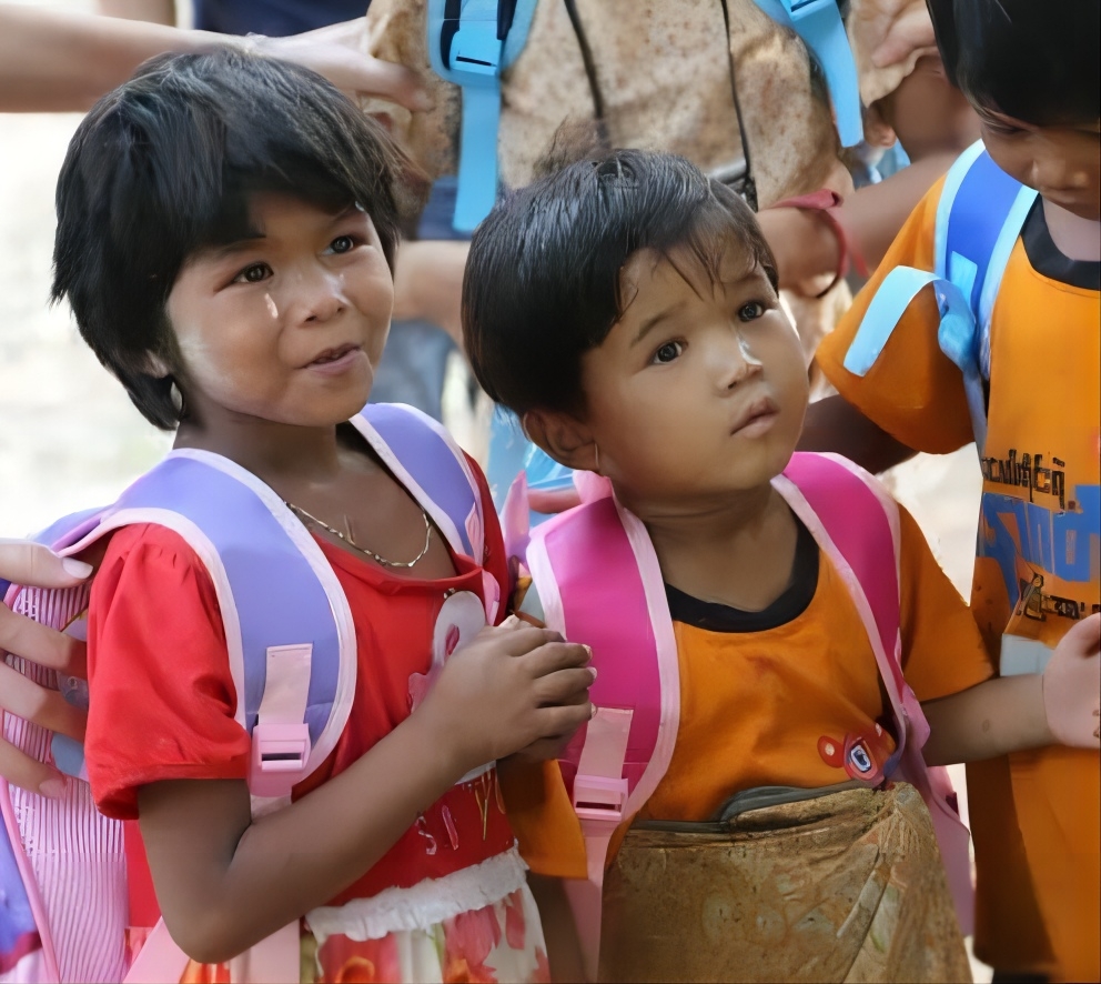 幾個(gè)小孩子面對(duì)志愿者們陌生的面孔,表現(xiàn)得非常興奮,做出喜悅和歡迎的手勢(shì)迎接志愿者。當(dāng)為他們背上書(shū)包、送上糖果時(shí),孩子們?cè)诜块g里歡呼雀躍。孩子們天真爛漫、滿足幸福的神情也深深感染了志愿者。