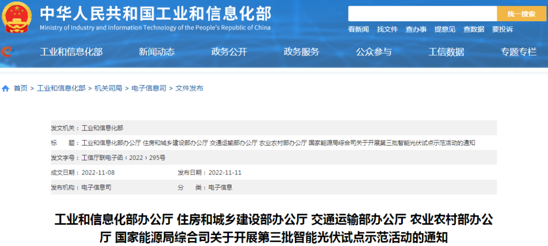 為進(jìn)一步促進(jìn)光伏產(chǎn)業(yè)與新一代信息技術(shù)深度融合,推動(dòng)智能光伏技術(shù)進(jìn)步和行業(yè)應(yīng)用,根據(jù)《智能光伏產(chǎn)業(yè)創(chuàng)新發(fā)展行動(dòng)計(jì)劃(2021—2025年)》(工信部聯(lián)電子〔2021〕226號(hào))工作部署,工業(yè)和信息化部、住房和城鄉(xiāng)建設(shè)部、交通運(yùn)輸部、農(nóng)業(yè)農(nóng)村部、國(guó)家能源局決定組織開(kāi)展第三批智能光伏試點(diǎn)示范活動(dòng)。有關(guān)事項(xiàng)通知如下: