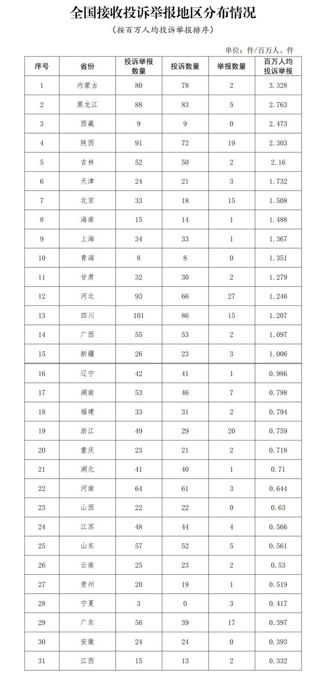 各省(自治區(qū)、直轄市)按照接收投訴舉報數量排序,四川、河北、陜西、黑龍江、內蒙古排在全國前5位。其中:按投訴數量排序,四川、黑龍江、內蒙古、陜西、河北排在全國前5位;按舉報數量排序,河北、浙江、陜西、廣東、北京(四川并列)排在全國前5位;按百萬人均投訴舉報數量排序,內蒙古、黑龍江、西藏、陜西、吉林排在全國前5位。(全國接收投訴舉報地區(qū)分布情況詳見附件1)